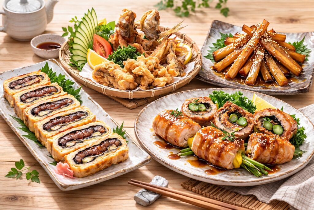 第一堂:蛋豆腐、烤鮭魚蘆筍卷、日月貝起司燒